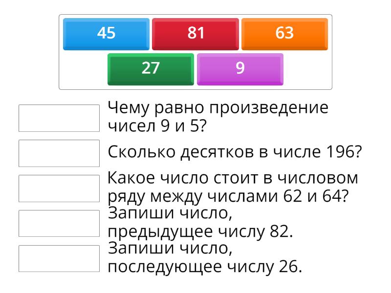 9 - Сколько десятков в числе 196?, 27 - Запиши число, последующее числу 26., 45 - Чему равно произведение чисел 9 и 5?, 63 - Какое число стоит в числовом ряду между числами 62 и 64?, 81 - Запиши число, предыдущее числу 82.,