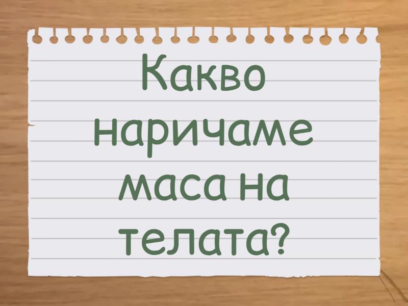 Какво наричаме тяло? - Предметите, обектите и живите същества, които ни заобикалят., Колко вида тела има? - Два вида - природни и направени от човека., Кои тела са природни? - Слънцето, скалите, растенията и животните., Кои тела са направени от човека? - Предметите, направени от човека - сгради, дрехи, играчки и др., Кои тела са от неживата природа? - Луна, скали, облаци, вода., Кои тела са от живата природа? - Животните, растенията, птиците, хората., От какво са изградени телата? - Телата са изградени от вещества., По какво си приличат телата? - Телата имат различна големина, форма и цвят, но всички имат маса и обем., Какво наричаме маса на телата? - Масата е свойството на телата да тежат. Измерва се в килограми., Какво наричаме обем на телата? - Обемът е част от пространството, което едно тяло заема.,