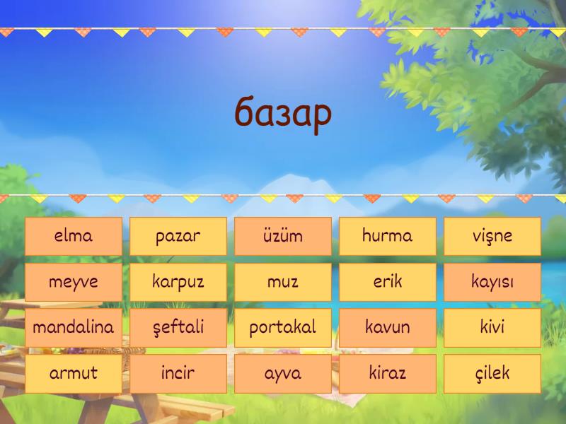 pazar - базар, meyve - фрукты, çilek - клубника, elma - яблоко, armut - груша, kiraz - черешня, vişne - вишня, mandalina - мандарин, portakal - апельсин, ayva - айва, kivi - киви, üzüm - виноград, erik - слива, incir - инжир, hurma - финики, kavun - дыня, karpuz - арбуз, kayısı - абрикос, muz - банан, şeftali - персик,