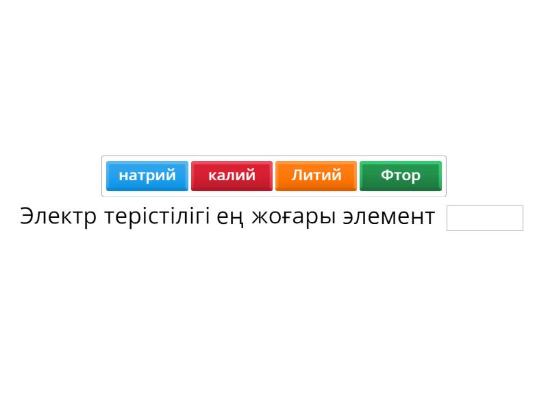 Электр терістілігі ең жоғары элемент ____ Әртүрлі бейметалдар атомдары арасындағы байланыс ____ Металдарға қандай элемент жатады? ____ Электр тогын нашар өткізеді? металдар ____ H2SO4 тің химиялық атауы?____ Сілтілік металды көрсет ____ Галогенді көрсет; ____ 1 период элементтерінің энергетикалық деңгейінің саны ____