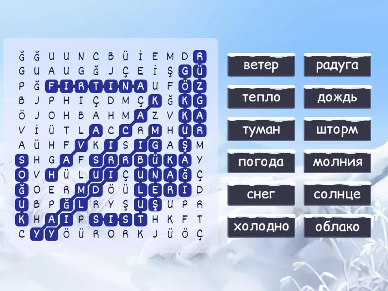hava - погода, güneş - солнце, bulut - облако, fırtına - шторм, yıldırım - молния, sis - туман, kar - снег, rüzgar - ветер, yağmur - дождь, sıcak - тепло, soğuk - холодно, gökkuşağı - радуга,