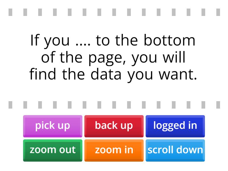 scroll down - If you .... to the bottom of the page, you will find the data you want. ,  back up - On these disks you will find a .... of all data connected with the project.,  zoom in - If you find it hard to see the details in the picture , so you can see more.,  zoom out - Then click on the same icon again to  ...and the picture will go back to normal size., pick up - Although I `ll working away from the office for a couple of weeks, I will still .... my emails every day. ,  logged in - I ... to this new website last night . Let me give you the address so that you can check it out. ,