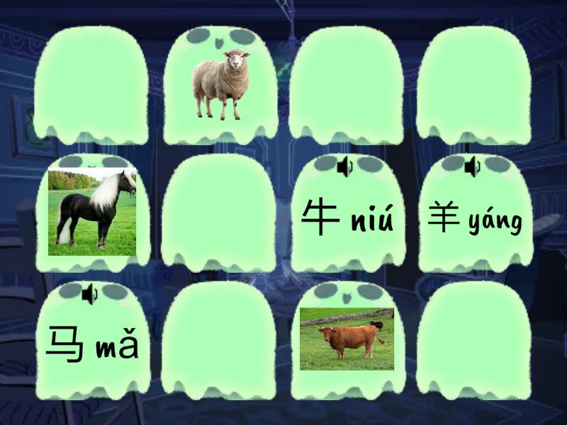 牛 niú, 羊 yáng, 马 mǎ, 鸡 jī, 猪 zhū, 鸭 yā,