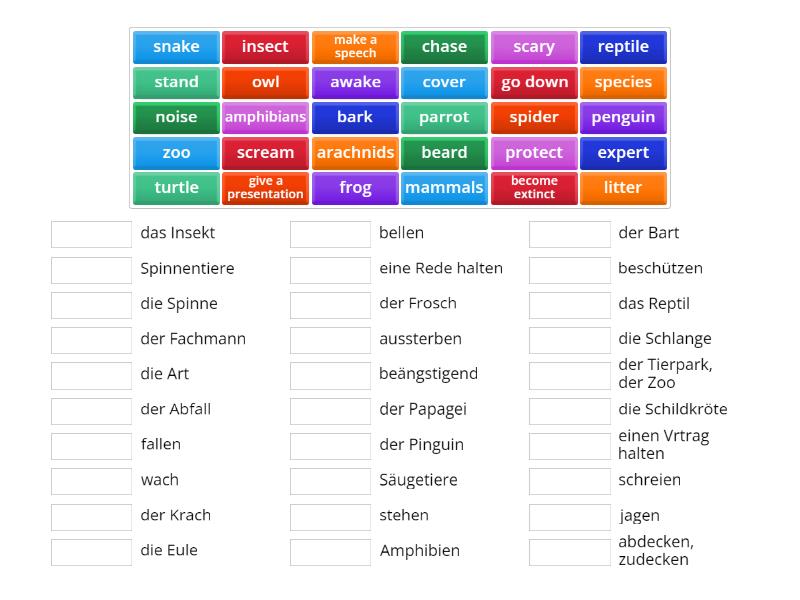 cover - abdecken, zudecken, frog - der Frosch, insect - das Insekt, owl - die Eule, parrot - der Papagei, penguin - der Pinguin, reptile - das Reptil, snake - die Schlange, spider - die Spinne, turtle - die Schildkröte, zoo - der Tierpark, der Zoo, beard - der Bart, scream - schreien, stand - stehen, expert - der Fachmann, go down - fallen, litter - der Abfall, protect - beschützen, species - die Art, awake - wach, bark - bellen, chase - jagen, noise - der Krach, scary - beängstigend, mammals - Säugetiere, become extinct - aussterben, amphibians - Amphibien, arachnids - Spinnentiere, give a presentation - einen Vrtrag halten, make a speech - eine Rede halten,