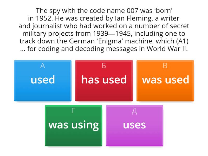 1) The spy with the code name 007 was ‘born’ in 1952. He was created by Ian Fleming, a writer and journalist who had worked on a number of secret military projects from 1939—1945, including one to track down the German ‘Enigma’ machine, which (A1) ... for coding and decoding messages in World War II. a) used b) has used c) was used d) was using e) uses 2) Another project was called ‘Golden Eye’, which later became the name of a Bond film — and Fleming’s house. Ian Fleming was born in England in 1908, but he wrote the ‘Bond’ novels in Jamaica, where he (A2) ... since 1945.  a) has lived b) s living c) lives d) had lived e) was lived 3) His cold-hearted but handsome hero (A3) ... after a war spy, but a local bird expert (Fleming was a keen birdwatcher). a) didn’t name b) wasn’t named c) wasn’t naming d) hasn’t named e) doesn't name 4) Fleming said that he (A4) ... an ordinary name, because that’s what he thought Bond was like. a) wanted b) has wanted c) wants d) was wanted e) will be wanted 5) Fleming’s fascinating spy (A5) ... in more than fifty years of Bond films, with Sean Connery first playing the role in 1962. a) is appearing b) will be appeared c) is appeared d) has appeared e) was appeared 6) But Fleming (A6) ... twelve Bond novels before he died in 1964. a) has only written b) was only written c) had only written d) was only writing e) is only written 7) The latest 'Bond' adventures (A7)... by new authors and screenwriters. Is 007 the spy who lives forever? a) will now write b) now write c) are now writing d) have now written e) are now written