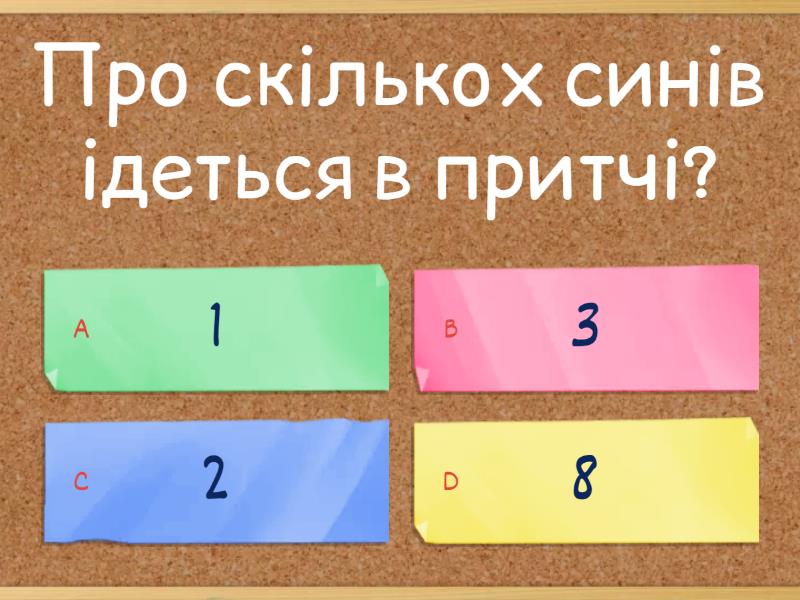 1) Про скількох синів ідеться в притчі? a) 1 b) 3 c) 2 d) 8 2) Хто в сім'ї виявився непокірним, неслухняним (блудним)? a) старший син b) батько c) мати d) молодший син 3) На що блудний син витратив час і гроші? a) вклав у прибуткову справу b) витратив їх, живучи розпустно c) розпочав власний бізнес d) купив собі свиней 4) Ким став працювати блудний син, коли в нього закінчились гроші? a) фермером b) айтішником c) продавцем ринку d) свинопасом 5) Які були емоції в батька, коли він побачив сина? a) гнів b) співчуття (жаль) c) ненависть d) байдужість 6) Що подарував батько синові, який повернувся? a) одежу, головний убір, сандалі b) одежу, накидку, перстень c) одежу, перстень, сандалі d) половину поля 7) Де був старший син, коли молодший повернувся? a) на полі b) спілкувався з друзями c) випасав отару d) на ринку 8) Ким хотів бути молодший син, повернувшись додому? a) наймитом b) управителем c) старшим сином d) господарем 9) Чому старший син повинен був радіти? a) що молодшому брату подаровано новий одяг b) що брат був пропав і знайшовся c) що йому подарували золотий перстень d) що багато їжі на святі 10) Яким є Бог згідно з цією притчею? a) грізним суддею, який тільки те й робить, що карає людей b) байдужим до життя людей c) Небесним Батьком, який прощає з любов'ю