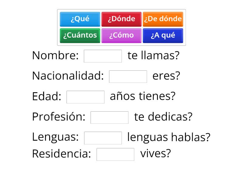 Nombre: ____ te llamas? Nacionalidad: ____ eres? Edad: ____ años tienes? Profesión: ____ te dedicas? Lenguas: ____ lenguas hablas? Residencia: ____ vives?