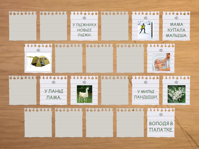 У ЛАНЫ ЛАМА., У МИЛЫ ЛАНДЫШИ., ВОЛОДЯ В ПАЛАТКЕ., У ЛЫЖНИКА НОВЫЕ ЛЫЖИ., МАМА КУПАЛА МАЛЫША., В КОЛОДЦЕ ХОЛОДНАЯ ВОДА., ВЕСНОЙ ПЧЁЛЫ ГОЛОДНЫЕ., ЛАДА ПОЛОЛА ЛУК., ЛУНА КАЗАЛАСЬ ГОЛУБОЙ., СВЕТЛАНА ГОТОВИЛА ГОЛУБЦЫ., ФЁКЛА НАЛИЛА ХОЛОДНОЕ МОЛОКО.,
