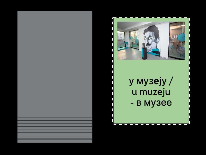 на послу / na poslu - на работе, код куће / kod kuće - дома, у ресторану / u restoranu - в ресторане, на мору / na moru - на море, у продавници / u prodavnici - в магазине, на часу / na času - на уроке, у граду / u gradu - в городе, у планинама / u planinama - в горах, у парку / u parku - в парке, на пијаци / na pijaci - на рынке, на концерту / na koncertu - на концерте, у биоскопу / u bioskopu - в кино, у апотеци / u apoteci - в аптеке, у библиотеци / u biblioteci - в библиотеке, на факултету / na fakultetu - на факультете , на састанку / na sastanku - на встрече / собрании / свидании, на изложби / na izložbi на выставке, у музеју / u muzeju - в музее, на журки / na žurci - на журци на вечеринке, у банци / u banci - в банке.