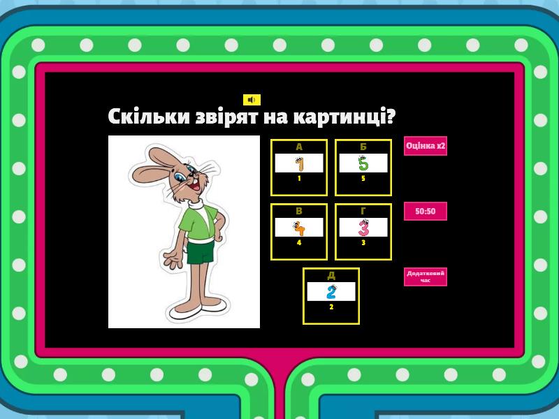 1) Скільки звірят на картинці? a) 1 b) 5 c) 4 d) 3 e) 2 2) Скільки яблучок ти бачиш? a) 5 b) 2 c) 1 d) 3 e) 4 3) Скільки свинок на картинці? a) 2 b) 1 c) 3 d) 4 e) 5 4) Скільки машин ти бачиш ? a) 2 b) 4 c) 3 d) 1 e) 5 5) Скільки діток на картинці? a) 1 b) 3 c) 5 d) 7 e) 2
