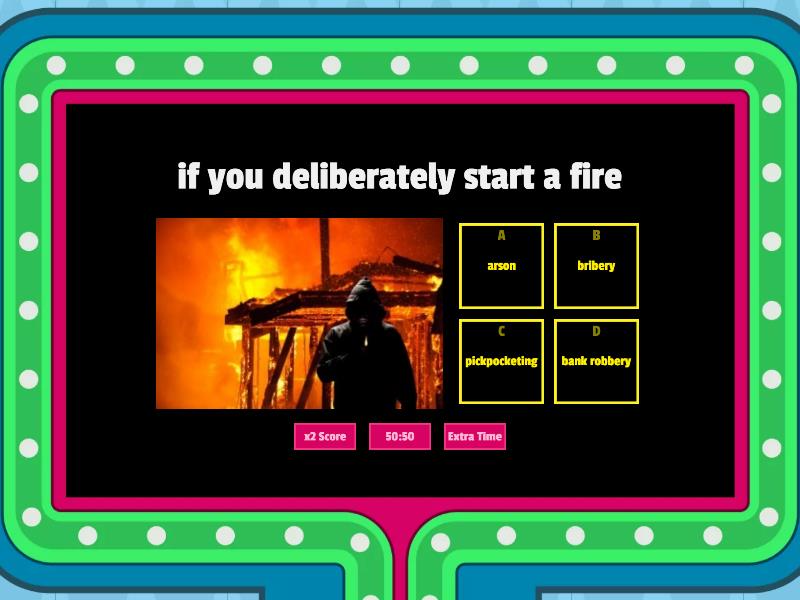 1) if you deliberately start a fire a) arson b) bribery c) pickpocketing d) bank robbery 2) if you abduct somebody and hold them captive a) speeding b) blackmailing c) kidnapping d) smuggling 3) if you enter a building and steal things a) vandalism b) burglary c) terrorist attack d) shoplifting 4) if you steal money from a bank a) bank robbery b) fraud c) arson d) smuggling 5) if you steal items from a shop a) terrorist attack b) fraud c) shoplifting d) murder 6) if you steal things secretly out of pockets or bags a) pickpocketing b) murder c) shoplifting d) arson 7) if you threaten someone to reveal some information unless you get paid for remaining silent a) burglary b) blackmailing c) bribery d) kidnapping 8) if you gain money by trick a) murder b) fraud c) shoplifting d) terrorist attack 9) if you kill someone a) murder b) speeding c) burglary d) bank robbery 10) if you damage public property a) kidnapping b) blackmailing c) fraud d) vandalism 11) if you illegal take goods from country to country a) pickpocketing b) arson c) smuggling d) bank robbery 12) if you get or give money in exchange for doing something in return a) blackmailing b) bribery c) murder d) arson 13) if you drive too fast a) speeding b) blackmailing c) smuggling d) burglary 14) planned and violent attack in pursuit of political, religious and ideological objectives a) fraud b) speeding c) terrorist attack d) kidnapping