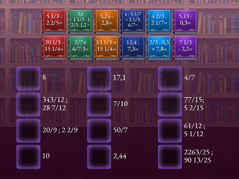 13 1/3 + 15 1/4= - 343/12 ; 28 7/12, 20 1/3 - 15 1/4= - 61/12 ; 5 1/12, 4 2/3 . 2 1/7= - 10, 5 1/3 : 2 2/5= - 20/9 ; 2 2/9, 2/7+ 6/7:3= - 4/7 , 5,24 - 2,8= - 2,44, 12,4 . 7,3= - 2263/25 ; 90 13/25, 5,13 : 0,3= - 17,1, 7 1/3 - 2,2= - 77/15; 5 2/15, 2/3 . 0,3 + 7,8= - 8, 3,6 : 1 1/3 - 1 2/3. 1,2 = - 7/10, x - 5 1/7 = 2 1/3. 6/7= - 50/7 ,