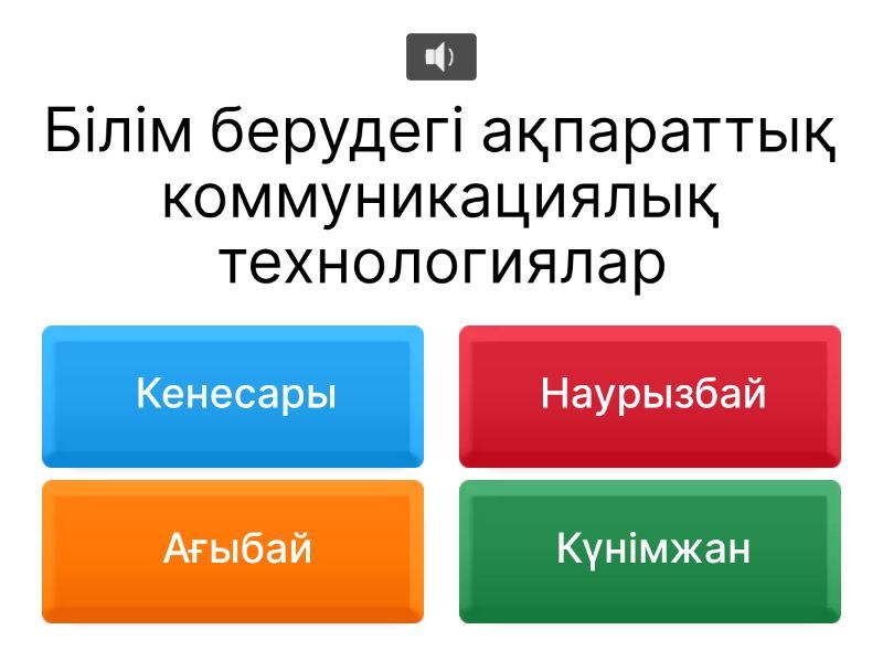 1) Білім берудегі ақпараттық коммуникациялық технологиялар a) Кенесары b) Наурызбай c) Ағыбай d) Күнімжан