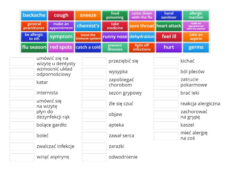 allergic reaction - reakcja alergiczna, backache - ból pleców, be allergic to sth - mieć alergię na coś, boost the immune system - wzmocnić układ odpornościowy, catch a cold - przeziębić się, chemist's - apteka, come down with the flu - zachorować na grypę, cough - kaszel, dehydration - odwodnienie, feel ill - źle się czuć, fight off infections - zwalczać infekcje, flu season - sezon grypowy, food poisoning - zatrucie pokarmowe, germs - zarazki, general practitioner - internista, hand sanitiser - płyn do dezynfekcji rąk, heart attack - zawał serca, hurt - boleć, make an appointment - umówić się na wizytę, make an appointment with the dentist - umówić się na wizytę u dentysty, prevent illnesses - zapobiegać chorobom, red spots - wysypka, runny nose - katar, sneeze - kichać, sore throat - bolące gardło, symptom - objaw, take an aspirin - wziąć aspirynę, take medicine - brać leki,