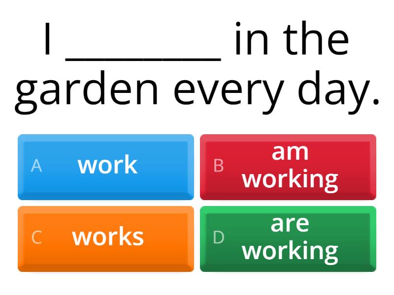1) I ________ in the garden every day. a) work b) am working c) works d) are working 2) My Mum always __________________ to work by car. a) go b) goes c) is going d) are going 3) I__________________ to school at the moment. a) go b) goes c) am going d) is going 4) I ____ pizza. a) like b) likes c) am liking d) are liking 5) I always _____________ he is funny. a) think b) thinks c) am thinking d) is thinking 6) I _______________________ a book now! a) read b) reads c) am reading d) is reading 7) Look, the boys _____________________ football now. a) play b) plays c) are playing d) is playing 8) I _______________________ Maths. a) don´t like b) doesn´t like c) am not liking d) is not liking 9) My brother _____________________ any musical instrument. a) don´t play b) doesn´t play c) aren´t playing d) isn't liking 10) We ______ football on Mondays. a) play b) plays c) are playing d) is playing 11) He ______ books in the evenings. a) read b) reads c) is reading d) are reading 12) He ____ Netflix at the moment. a) watch b) watches c) is watching d) am watching 13) They never _______ at home. a) study b) studies c) is studying d) are studying 14) You ______ right now. a) talk b) talks c) is talking d) are talking