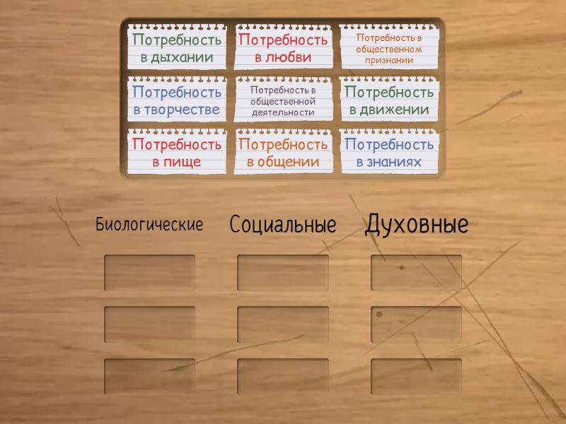Биологические: Потребность в пище, Потребность в движении, Потребность в дыхании, Социальные : Потребность в общении, Потребность в общественном признании, Потребность в общественной деятельности, Духовные: Потребность в знаниях, Потребность в творчестве, Потребность в любви,