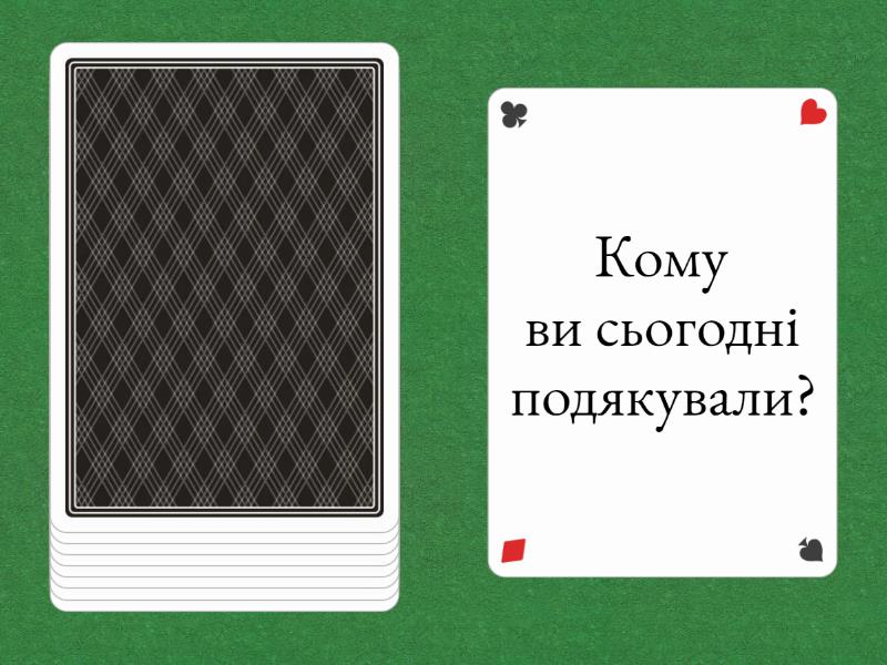 Кому ви востаннє щось подарували?, Кому ви востаннє побажали «смачного»?, Кому ви зазвичай розповідаєте жарти?, Кому ви востаннє допомогли?, Кому ви сьогодні подякували?, Кому ви сьогодні сказали "Будь чемний!"?, Кому ви сьогодні купите солодощі?, Кому ви сьогодні будете читати лекцію?, Кому ви сьогодні будете читати казку?.