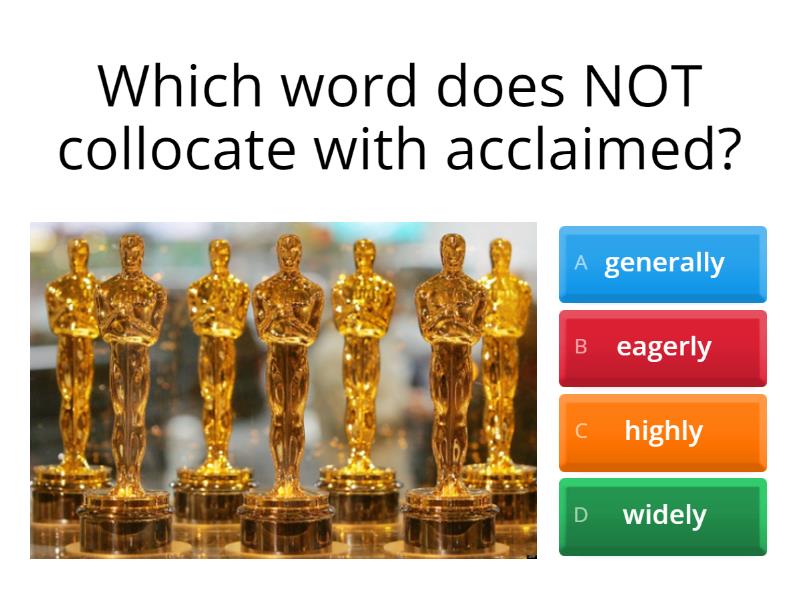 1) Which word doesn't collocate with 'anticipated'? a) eagerly b) generally c) widely d) wonderfully 2) Which word doesn't collocate with 'appalling'? a) absolutely b) completely c) eagerly d) totally e) utterly 3) This art work is *blank* distinctive - I've never seen anything like it! a) completely b) highly c) perfectly d) totally 4) That film is utterly *blank* - you should totally see it! a) enjoyable b) hilarious c) imaginative d) anticipated 5) The plot in the book is profound, I've never read anything so *blank* imaginative. a) deeply b) highly c) perfectly d) wonderfully 6) I mean, it was OK, there were some good parts, but overall, I find it *blank* overrated.  a) dreadfully b) generally c) deeply d) widely e) utterly 7) Which words collocate with pointless? a) absolutely b) completely c) dreadfully d) generally e) utterly f) widely 8) Which word does NOT collocate with acclaimed? a) generally b) eagerly c) highly d) widely 9) He is a *blank* talented actor. a) absolutely b) completely c) highly d) perfectly e) wonderfully 10) That series is *blank* tedious, I don't know how you can watch it.  a) dreadfully b) highly c) totally d) utterly 11) Which words collocate with unconventional? a) completely b) highly c) perfectly d) totally e) utterly f) wonderfully
