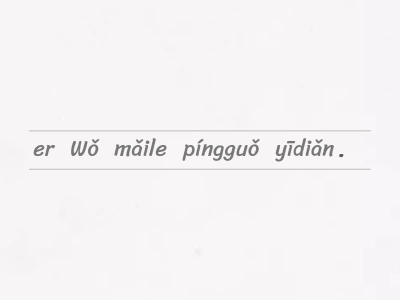 Wǒ mǎile yīdiǎn er píngguǒ., Tā qù xué kāichē le., Tā mǎi le bù shǎo yīfú., Nǐ kànjiàn le jǐ gè rén?, Tā qù túshūguǎn le., Wǒ shuì le liǎng gè xiǎoshí., Tā huílái yi gè yuè le., Wǒ zài zhè zhùle wǔ nián., Nǐ zuò zuò yè le ma., Tā chīle sān gè píngguǒ., Tóngxuémen méi lái xuéxiào., Wǒ jīntiān shàngwǔ méi qù yīyuàn., Wǒ méi kànjiàn zhāng xiānshēng., Wǒ méi mǎi, zhèxiē dōngxī shì tā de., Wǒ méi chīfàn.,