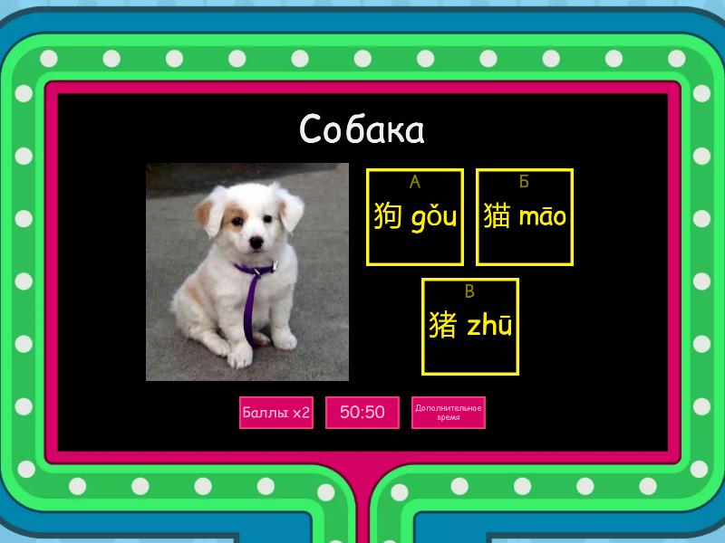 1) Собака a) 狗 gǒu b) 猫 māo c) 猪 zhū 2) Кошка a) 猫 māo b) 猪 zhū c) 狗 gǒu 3) Лошадь a) 驴 lǘ b) 猫 māo c) 马 mǎ 4) Свинья a) 狗. gǒu b) 猪 zhū c) 鹿 lù 5) Курица a) 母鸡 mǔjī b) 鸭子 yāzi c) 母牛 mǔniú 6) Корова a) 狐狸 húli b) 母牛 mǔniú c) 鸭子 yāzi 7) Лиса a) 母鸡 mǔjī b) 兔子 tùzi c) 狐狸 húli 8) Белка a) 兔子 tùzi b) 松鼠 sōngshǔ c) 母牛 mǔniú 9) Заяц a) 兔子 tùzi b) 狐狸 húli c) 母鸡 mǔjī 10) Медведь a) 狼 láng b) 熊 xióng c) 马 mǎ 11) Волк a) 狼 láng b) 熊 xióng c) 猪 zhū 12) Панда a) 母牛 mǔniú b) 熊猫 xióngmāo c) 熊 xióng