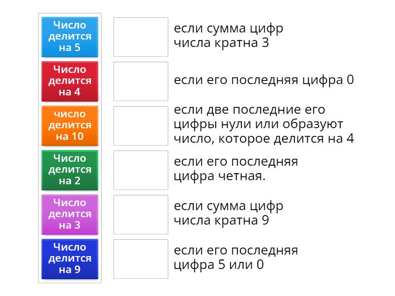 Число делится на 2  - если его последняя цифра четная. , Число делится на 3 - если сумма цифр числа кратна 3, Число делится на 9 - если сумма цифр числа кратна 9 , Число делится на 5 - если его последняя цифра 5 или 0, число делится на 10 - если его последняя цифра 0, Число делится на 4 - если две последние его цифры нули или образуют число, которое делится на 4,