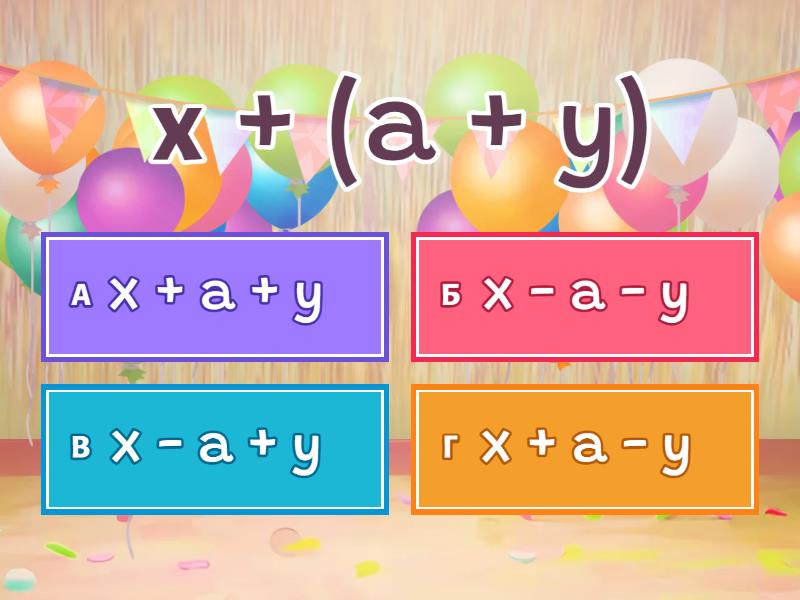 1) х + (a + y) a) x + a + y b) x - a - y c) x - a + y d) x + a - y 2) p - (m + n) a) p - m + n b) p - m - n c) p + m - n d) p + m + n 3) a - (-b + c) a) a + b + c b) a - b + c c) a + b - c d) a - b - c 4) - (a + b) + c a) a + b + c b) a - b + c c) -a - b - c d) -a - b + c 5) a + (-m - n) a) a + m + n b) a - m - n c) a + m - n d) a - m + n 6) a - (t + p) a) a - t + p b) a + t - p c) -a - t - p d) a - t - p 7) (a + b + c) a) a + b + c b) -a + b - c c) a - b - c d) a - b+ c 8) - (d + b - t) a) -d + b+ t b) -d - b - t c) -d - b + t d) d - b + t 9) -(a + b) + (c - d) a) -a + b - c + d b) -a - b + c - d c) a + b + c - d d) a - b - c - d 10) (m+3)-(k-5) a) m+3-k-5 b) -m-3+k+5 c) m+3 - k+5 d) m-3 - k + 5 11) 4 - (a + 2) a) 4 - a + 2 b) -4 - a - 2 c) 4 +a + 2 d) 4 - a-2