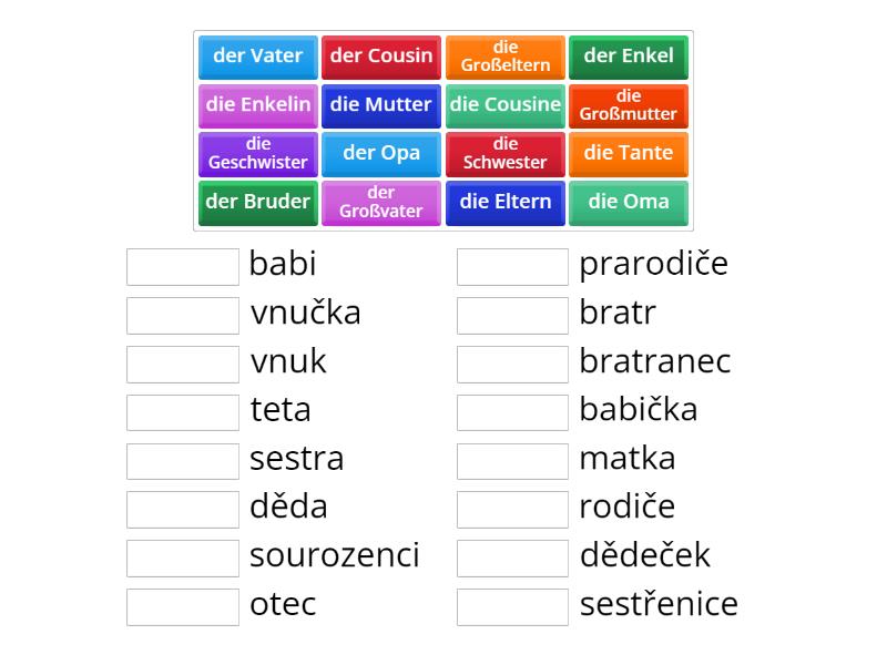 die Tante - teta, die Mutter - matka, der Vater - otec, die Schwester - sestra, der Bruder - bratr, die Cousine - sestřenice, der Cousin - bratranec, der Opa - děda, die Oma - babi, der Großvater - dědeček, die Großmutter - babička, die Großeltern - prarodiče, die Eltern - rodiče, die Geschwister - sourozenci, der Enkel - vnuk, die Enkelin - vnučka,