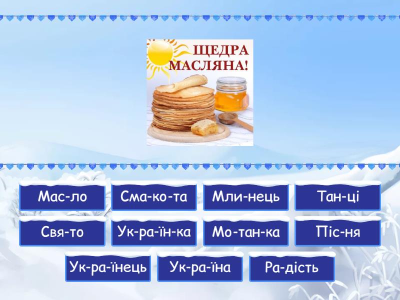 Свя-то, Мли-нець, Мо-тан-ка, Тан-ці, Ра-дість, Піс-ня, Мас-ло, Сма-ко-та, Ук-ра-їна, Ук-ра-їнець, Ук-ра-їн-ка,