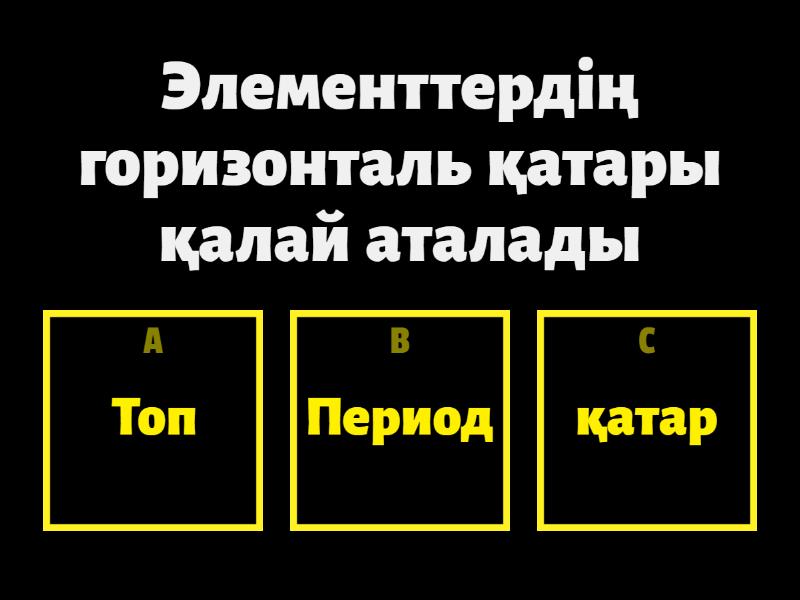 1) Элементтердің горизонталь қатары қалай аталады a) Топ b) Период c) қатар 2) Неше период бар a) 8 b) 6 c) 7 3) кіші периодқа жатады a) 1-3 b) 4-7 c) 5-6 4) Элементтердің вертикаль қатары қалай a) период b) топ c) қатар 5) ІА тобы қалай a) инертті  газдар b) сілтілік металдар c) бейметалдар 6) Металдар патшасы деп аталатын элемент a) кальций b) калий c) Франций 7) Ең жеңіл металл a) литий b) сутек c) оттек 8) инертті газды тап a) рубидий b) аргон c) талий 9) қызыл қоңыр сұйықтық болатын галоген a) фтор b) хлор c) бром 10) Ауыспалы металдарға жатады a) магнийй,рубидий, астат b) натрий, галий c) алтын, күміс, платина