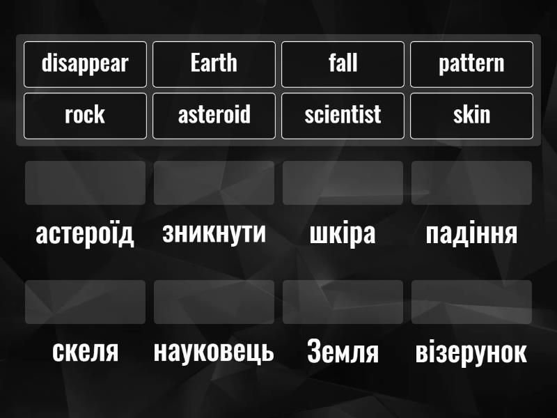 Earth - Земля, scientist - науковець, pattern - візерунок, skin - шкіра, disappear - зникнути, rock - скеля, asteroid - астероїд, fall - падіння,