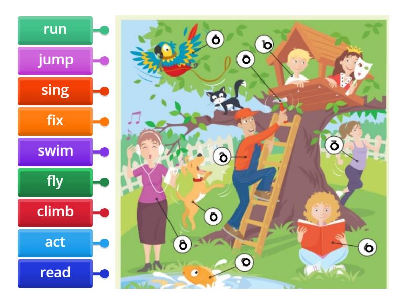 act, climb, fix, fly, jump, read, run, sing, swim.