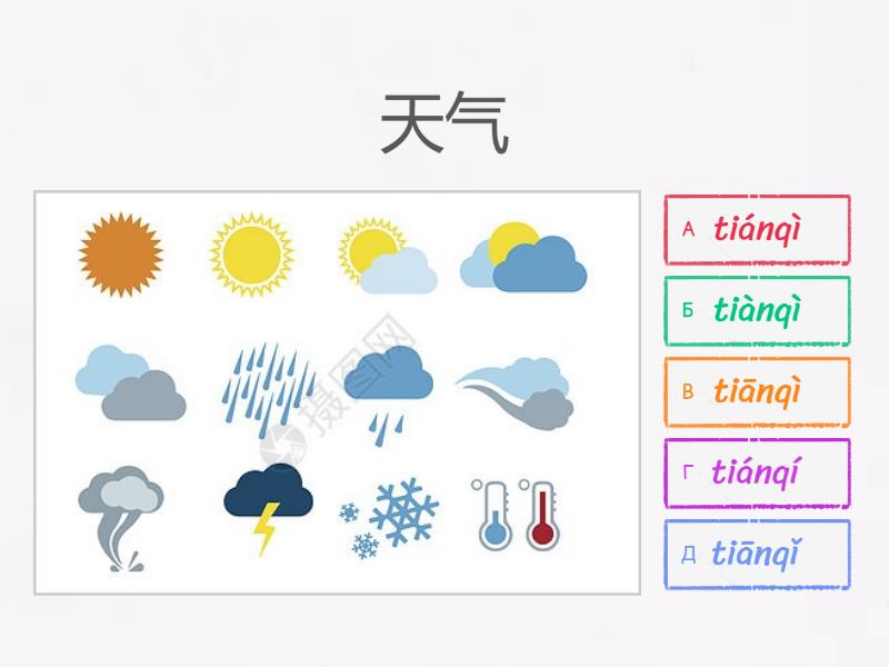 1) 天气 a) tiánqì b) tiànqì c) tiānqì d) tiánqí e) tiānqǐ 2) 怎么样 a) zēnméyàng b) zěnmeyàng c) zénmeyáng d) zénmeyàng 3) 不太 a) bú tài b) bù tài c) bǔ tāi d) bù tái 4) 太...了 a) tài...le  b) tái...le c) tǎi...le d) tāi...le 5) 热 a) rē b) ré c) rě d) rè 6) 冷 a) lēng b) léng c) lěng d) lèng 7) 下雨 a) xiàyǔ  b) xiáyú c) xiǎyǔ 8) 小姐 a) xiǎojiě b) xiǎojiē c) xiǎojie 9) 来 a) lāi b) lái c) lǎi d) lài 10) 身体 a) shēntǐ  b) shěntǐ c) shēntí d) shéntí 11) 爱 a) āi b) ái c) ǎi d) ài 12) 些 a) xiē b) xié c) xiě d) xiè 13) 水 a) shuī b) shuí c) shuǐ d) shuì 14) 水果 a) shuíguǒ  b) shuíguó c) shuǐguǒ d) shuǐguó