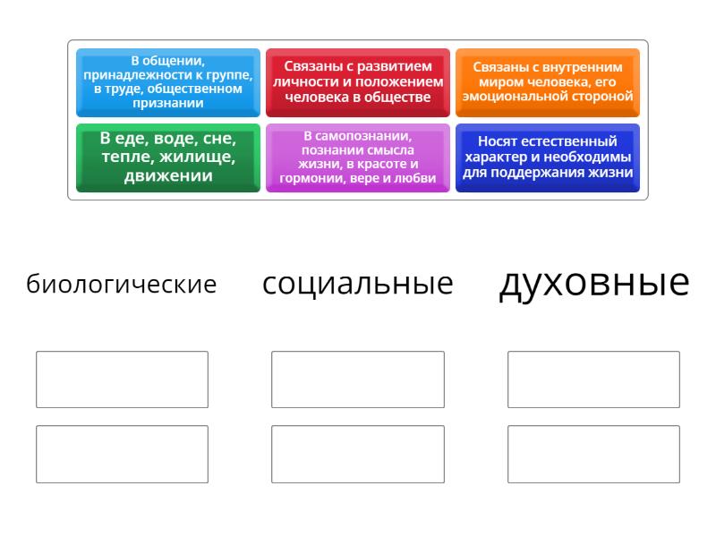 биологические: Носят естественный характер и необходимы для поддержания жизни, В еде, воде, сне, тепле, жилище, движении, социальные: Связаны с развитием личности и положением человека в обществе, В общении, принадлежности к группе, в труде, общественном признании, духовные: Связаны с внутренним миром человека, его эмоциональной стороной, В самопознании, познании смысла жизни, в красоте и гормонии, вере и любви,
