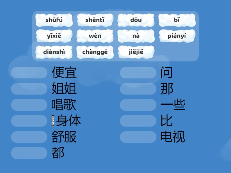 shēntǐ - 身体, shūfú - 舒服, diànshì - 电视, wèn - 问, chànggē - 唱歌, nà - 那, jiějiě - 姐姐, bǐ - 比, dōu - 都, piányí - 便宜, yīxiē - 一些,
