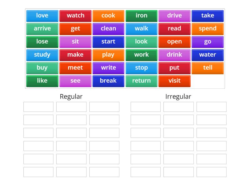 Regular: clean, stop, watch, arrive, return, cook, walk, visit, work, look, like, iron, play, study, love, open, start, water, Irregular: buy, drink, lose, make, go, tell, take, write, spend, see, sit, drive, get, read, put, break, meet,