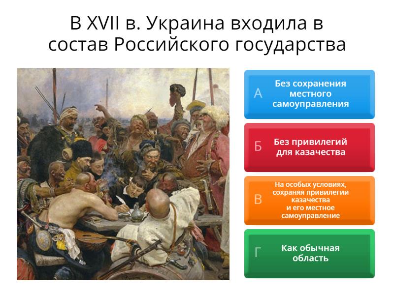 1) В XVII в. Украина входила в состав Российского государства a) Без сохранения местного самоуправления b) Без привилегий для казачества c) На особых условиях, сохраняя привилегии казачества и его местное самоуправление d) Как обычная область 2) В августе 1963 года в Москве был подписан договор: a) О сокращении ядерных вооружений. b) О сокращении ракет средней дальности. c) О запрещении ядерных испытаний в трех сферах. d) Об ограничении стратегических вооружений. 3) В Англии утверждена конституционная монархия в: a) 1689 г. b) 1688 г. c) 1686 г. d) l653 г. 4) В период Великих географических открытий испанцы захватили: a) Индию. b) Японию. c) Всю Южную Америку. d) Африку 5) В период последних захватнических войн римлян императором в Риме был: a) Траян. b) Цезарь. c) Август. d) Октавиан. 6) В программу олимпийских состязаний входило: a) Троеборье. b) Девятиборье. c) Пятиборье. d) Семиборье 7) В разделах Речи Посполитой принимали участие государства: a) Россия, Австрия и Пруссия. b) Пруссия и Англия. c) Россия и Франция. d) Австрия и Османская империя 8) В результате III раздела Польши Россия получила: a) Коренные польские земли. b) Восточную Белоруссию. c) Правобережную Украину. d) Западную Белоруссию, Литву и Курляндию. 9) В результате буржуазной революции в Англии установилась форма правления: a) Парламентская республика. b) Абсолютная монархия. c) Военная диктатура. d) Конституционная монархия. 10) В результате Великих географических открытий: a) Возникла мировая торговля. b) Разрушены мировые торговые связи. c) Развивалась культура народов Америки. d) Улучшилась жизнь народов Америки. 11) В результате войны 1941- 1945 гг. в Советском Союзе было разрушено: a) 1710 городов b) 1700 городов c) 1610 городов d) 1620 городов 12) В результате социалистических преобразований в 40-50-х годах Монголия превратилась: a) В индустриальную страну. b) В аграрно-индустриальную страну. c) В страну с развитым земледелием. d) В скотоводческую страну. 13) В результате франко-прусской войны Францией были утеряны территории: a) Эльзас, Лотарингия. b) Па-де-Кале, Бордо. c) Лангедок, Ницца. d) Корсика, Марокко. 14) В родовых общинах основными являлись: a) Соседские связи. b) Дружественные связи. c) Хозяйственные связи. d) Родственные связи. 15) В России абсолютизм оформился при: a) Екатерине П. b) Петре I. c) Николае I. d) Александре I 16) В России революционная молодежь предприняла массовую попытку "хождения в народ" в: a) 1862 г. b) 1881 г. c) 1861 г. d) 1874 г. 17) В русско-турецкой войне 1787-1791 гг. русский флот под командованием Ф.Ушакова нанес урон турецкой эскадре в ... a) проливе Босфор. b) в Азовском море. c) проливе Дарданеллы. d) Керченском проливе. 18) В русско-турецкой войне 1787-1791 годов А.В.Суворов сбросил в море турецкий десант у ключевого пункта русской обороны Причерноморья - крепости ... a) Кинбурн. b) Севастополь. c) Керчи. d) Еникале 19) В середине V века гуннов возглавил воинственный вождь, прозванный современниками "бичом божьим" a) Аттила b) Хлодвиг c) Карл d) Алларих 20) В середине VIII века до нашей эры государство Урарту вело успешные войны с: a) Парфией. b) Ассирией. c) Венгрией. d) Византией. 21) В середине XIV века в Китае началось восстание, получившие название: a) Красных повязок b) Синих повязок c) Белых повязок d) Желтых повязок 22) В творчестве художников-передвижников отражается блестящий расцвет: a) Реализма. b) Модернизма. c) Кубизма. d) Символизма. 23) В ходе так называемой "культурной революции" Мао Цзеду