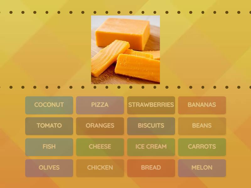 CHEESE, PIZZA, BREAD, FISH, ORANGES, TOMATO, CHICKEN, ICE CREAM, MELON, BANANAS, COCONUT, STRAWBERRIES, BISCUITS, BEANS, CARROTS, OLIVES,