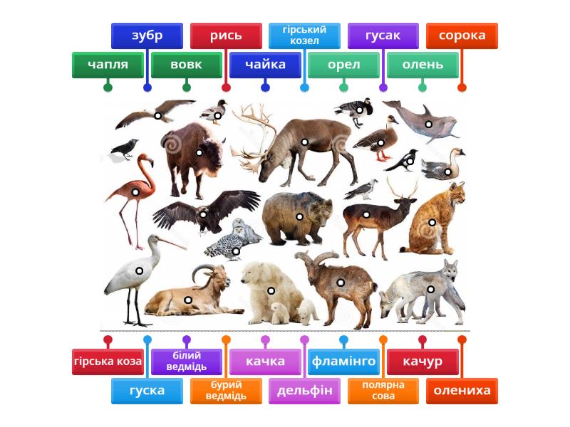 фламінго, рись, бурий ведмідь, вовк, дельфін, зубр, олень, олениха, білий ведмідь, гірський козел, гірська коза, полярна сова, чапля, качка, чайка, орел, сорока, гусак, гуска, качур.