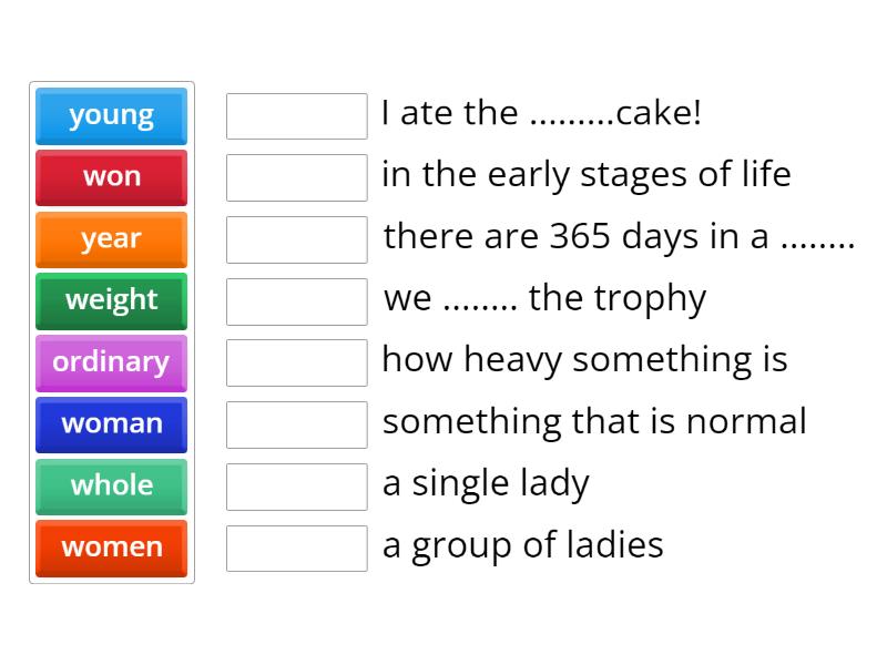 weight - how heavy something is, whole - I ate the .........cake!, woman - a single lady , women - a group of ladies , won - we ........ the trophy, year - there are 365 days in a ........, young - in the early stages of life, ordinary - something that is normal,