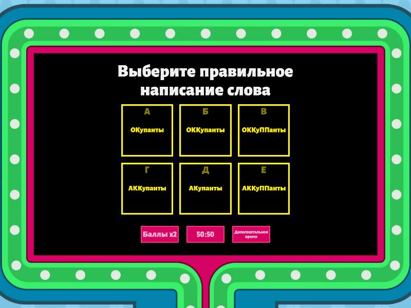1) Выберите правильное написание слова a) ОКупанты b) ОККупанты c) ОККуППанты d) АККупанты e) АКупанты f) АККуППанты 2) Выберите правильное написание слова a) ОККуратный b) АККуратный c) АКуратный d) ОКуратный e) АККураТТный f) ОККураТТный 3) Выберите правильное написание слова a) мАКуЛЛАтура b) мАККуЛАтура c) мАКуЛАтура d) мОКуЛАтура e) мАКуЛОтура 4) Выберите правильное написание слова a) аКорД b) оККорД c) аККорДД d) аККорД e) аКоРРД f) оКорД 5) Выберите строку, где все слова написаны правильно a) аппетит, макулатура, окупанты, аккуратный, аккордисполин, телевидение, дерижёр b) аппетит, макулатура, оккупанты, акуратный, аккорд c) аппетит, макулатура, оккупанты, аккуратный, аккорт d) аппетит, макулатура, оккупанты, аккуратный, аккорд e) апетит, макулатура, оккупанты, аккуратный, аккорд f) аппетит, мокулатура, оккупанты, аккуратный, аккорда