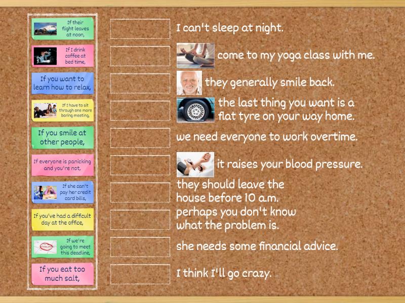 If we're going to meet this deadline, - we need everyone to work overtime., If you've had a difficult day at the office, - the last thing you want is a flat tyre on your way home., If I drink coffee at bed time, - I can't sleep at night., If she can't pay her credit card bills, - she needs some financial advice., If you want to learn how to relax, - come to my yoga class with me., If their flight leaves at noon, - they should leave the house before 10 a.m., If you eat too much salt, - it raises your blood pressure., If you smile at other people, - they generally smile back. , If I have to sit through one more boring meeting, - I think I'll go crazy., If everyone is panicking and you're not, - perhaps you don't know what the problem is. ,