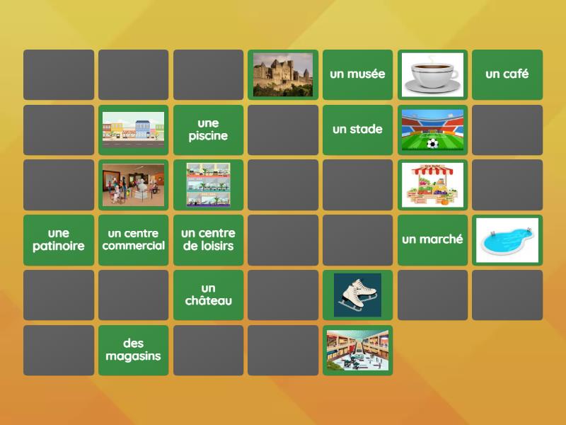une patinoire, un château, des magasins, un café, un centre commercial, un marché, un centre de loisirs, une piscine , un musée, un stade, un cinéma, un parc, une plage , le croissant, les céréales , les fruits, le pain, le lait, le chocolat chaud, la confiture ,