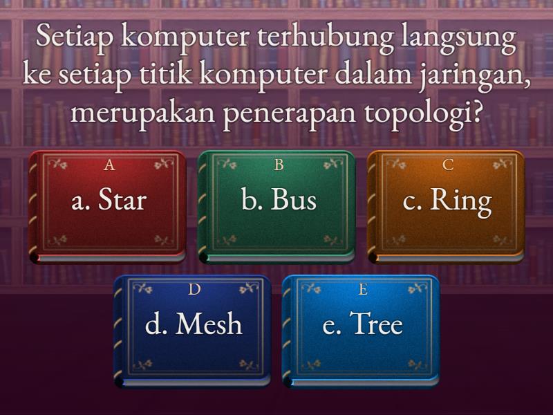 1) Setiap komputer terhubung langsung ke setiap titik komputer dalam jaringan, merupakan penerapan topologi? a) a. Star  b) b. Bus c) c. Ring d) d. Mesh e) e. Tree 2) Topologi jaringan yang merupakan gabungan dari topologi star dan topologi bus merupakan pengertian dari ... a) a. Topologi Star b) b. Topologi Bus c) c. Topologi Ring d) d. Topologi Tree e) e. Topologi Mesh 3) Perangkat keras yang digunakan untuk mengcover daerah-daerah yang lemah sinyal WIFI dari server (pemancar) adalah ... a) a. Hub  b) b. Switch c) c. Workstation d) d. Repeater e) e. Router 4) Bagian yang mengubah sinyal kedalam sinyal pembawa (Carrier) dan siap untuk dikirimkan disebut .... a) a. Modulator  b) b. Demodulator c) c. Modem d) d. Sinyal Informasi e) e. Sinyal pesan / data 5) Komputer yang berlaku sebagai pusat data disebut .... a) a. Server  b) b. Client c) c. Domain d) d. Client-server e) e. Peer to peer 6) Dibawah ini yang termasuk manfaat jaringan computer, kecuali.. a) a. Aplikasi dapat dipakai bersama-sama (multiuser)  b) b. Mudah dalam melakukan backup data , karena management yang tersentralisasi. c) c. Komunikasi antar pemakai melalui email /LAN conference . d) d. Bisa menambah jumlah memory jika terjadi konsleting listrik e) e. dapat saling berbagai( sharing ) p ada pada server /pengguna file yang ada pada server /pada masing-masing workstation. 7) pada gambar merupakan perangkat input, Touchpad yang ada pada Laptop sama fungsinya dengan perangkat input... a) a. Mouse b) b. keyboard c) c. Camera d) d. scanner e) e. MMC 8) Dalam mengoperasikan Komputer perlu listrik untuk menyalakannya. Di CPU terdapat alat yang berfungsi menyuplai aliran listrik ke Mainboard dan beberapa perangkat keras lainnya yang terpasang pada Mainboard, alat tersebut yakni... a) a. Hardisk b) b. Proccessor c) c. Power Supplay d) d. Chipset e) e. Hardisk 9) Perangkat yang memancarkan sinyal gelombang radio atau wifi yang dapat menjangkau perangkat yang memiliki teknologi wifi, sering disebut... a) a. Infrared b) b. Hotspot c) c. Wifi Internal d) d. Internet e) e. Bluetooth 10) Perhatikan Gambar berikut, Dalam Jaringan komputer perangkat ini termasuk perangkat tambahan yang berguna untuk... a) a. mengirimkan paket data melalui jaringan internet dari sumber daya ke tujuannya b) b. mengubah informasi dari sinyal digital ke sinyal analog dan sebaliknya c) c. disebut konsentrator yang berfungsi sebagai pusat sambungan ang menghubungkan beberapa perangkat dalam jaringan d) d. media yang menjadi penghubung antar perangkat. e) e. menangkap sinyal dan menghubungkan sebuah perangkat ke jaringan nirkabel 11) dulu perhitungan data masih dilakukan secara manual dengan mencatat dalam lembar kertas seperti membuat tabel dan melakukan kalkulasi dari beberapa nilai, namun sekarang dengan perkembangan teknologi kebanyakan sudah memilih menggunakan komputer, Hal ini menandakan bahwa ada satu sistem yang dibutuhkan yakni... a) a. Sistem Komputasi b) b. Sistem Operasi c) c. Sistem Aplikasi d) d. Sistem Perkantoran e) e. Sistem Laporan 12) Berikut adalah salah satu perangkat pernyimpanan dan di tempatkan di dalam komputer dimana sistem operasi, program aplikasi dan data yang sedang berjalan dan digunakan akan disimpan, sering disebut... a) a. NIC b) b. Chipshet c) c. ROM d) d. RAM e) e. Hardisk 13) Komponen jaringan computer yang berfungsi memperkuat sinyal dengan cara menerima sinyal dan suatu segment kabel lalu memancarkan kembali sinyal tsb dengan kekuatan yang sama dengan sinyal aslinya pada segment kabel lain adalah... a) a. Modem b) b. Repeater c) c. Switch d) d. Hub e) e. NIC 14) Dalam Jaringan PAN sering satu komputer dapat menyambungkan ke banyak perangkat tambahan lain seperti Speaker, Microphone, Ponsel, Headset. Fasilitas yang umumnya digunakan untuk menghubungkan banyak periferal secara nirkabel di sebut... a) a. Infrared b) b. Hotspot c) c. Wifi d) d. Bluetooth e) e. Kabel data 15) Jaringan internet dibagi berdasarkan letak Geografisnya ada 4 jenis, pada gambar berikut merupakan bentuk jaringan... a) a. Personal Area Network b) b. Local Area Network c) c. Metropolitan Area Network d) d. Wide Area Network e) e. internet 16) Gambar berikut yang bukan jaringan Topologi adalah a) b) c) d) e) 17) perangkat eksternal yang bisa dihubungkan ke motherboard, kecuali... a) b) c) d) e) 18) Jika dalam leb ada sistem jaringan Client server dengan transmisi kebel, pernyataan berikut merupakan pernyataan yang benar, kecuali... a) Komputer Server bisa mengirimkan prodek multimedia ke semua komputer client b) Antara komputer 5 dengan komputer 25 bisa komunikasi lewat chat pada fasilitas jaringan c) Semua komputer clien bisa mencetak File dengan menggunakan 1 printer d) Komputer Client bisa menutup dan mengendalikan komputer Server e) Komputer Server bisa menginstal aplikasi pada komputer client nomer 4 19) Urutkan dari yang terkecil macam-macam jaringan berdasarkan letak geografis yang benar adalah a) Internet-MAN-LAN-WAN-PAN b) Internet-WAN-MAN-LAN-PAN c) LAN-PAN-WAN-MAN-Internet d) PAN-LAN-MAN-WAN-Internet e) PAN-LAN-WAN-MAN-Internet 20) Kabel UTP paling sering digunakan dalam membuat sebuah jaringan, kepanjangan dari utp adalah... a) Unshield Twisted Pair b) Unshielded Twisted Pair c) Unshielded Two Pair d) Unshield Two Pair e) Unshield Tree Pair