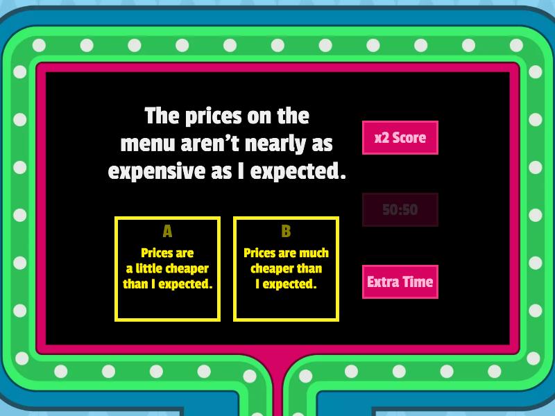 1) The prices on the menu aren't nearly as expensive as I expected. a) Prices are a little cheaper than I expected. b) Prices are much cheaper than I expected. 2) It looks as if your new car isn't any more reliable than the old one! a) Both cars are equally unreliable. b) The new car is slightly less reliable than the old one. 3) I have to say that the hotel wasn't quite as luxurious as the brochure claimed. a) The hotel was much less luxurious than the brochure claimed. b) The hotel was slightly less luxurious than the brochure claimed. 4) She isn't anything like as snobbish as you said. a) She is less snobbish than you said. b) She isn't snobbish. 5) I'm afraid your figures are no more accurate than the ones Rachel gave me. a) Your figures are less accurate than Rachel's. b) Your figures and Rachel's figures are equally inaccurate. 6) As far as Daniel's job is concerned, things are about as bad as they can be. a) Daniel's job could get worse. b) Daniel's job couldn't be any worse than it is. 7) Carol's nowhere near as efficient as my last assistant, Becky. a) Carol is slightly less efficient than Becky. b) Carol is much less efficient than Becky. 8) In his new job, Gerhard is working like a slave! a) Gerhard is an actor in a film about ancient Rome. b) Gerhard has to work very hard.