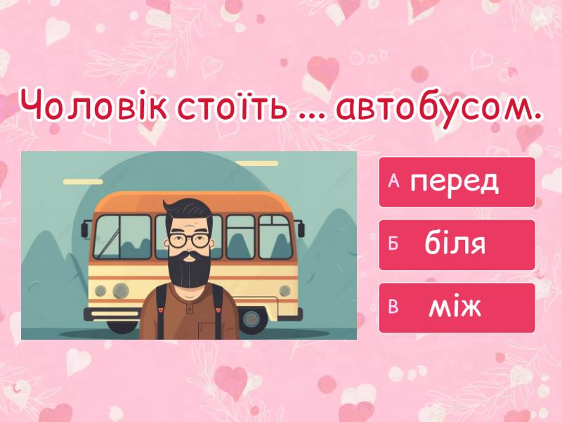 1) Чоловік стоїть ... автобусом. a) перед b) біля c) між 2) Водорості ростуть ... водою. a) за b) під c) коло 3) Сонце яскраво світить ... деревами. a) перед b) під c) між 4) ... нашого будинку ростуть красиві дерева. a) Біля b) Посеред c) Ліворуч від 5) Моя подруга сидить ... мене. a) праворуч від b) поруч зі c) ліворуч від 6) Самотнє дерево росте ... поля. a) між b) посеред c) перед 7) ... річки яскраво зацвіли квіти. a) Коло b) Над c) Із 8) Моя сестричка сидить ... мене. a) поряд з b) праворуч від c) перед 9) ... мого будинку є супермаркет. a) Над b) Поруч з c) Недалеко від 10) Я сфотографувалася ... високої гори. a) навпроти b) недалеко від c) перед 11) Марійка сидить ... своєю подружкою. a) між b) поруч із c) над 12) Мій брат любить вареники ... сметаною. a) над b) без c) із 13) Гучний літак пролетів ... містом. a) над b) між c) перед 14) Садок вишневий ... хати a) біля b) коло c) поруч з 15) Хрущі ... вишнями гудуть a) перед b) під c) над 16) Плугатарі ... плугами йдуть. a) з b) через c) без