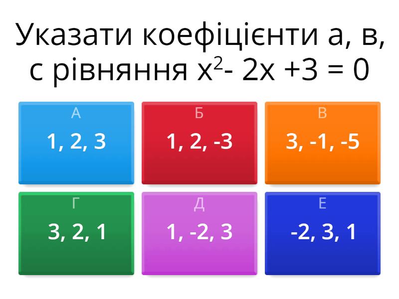 1) Указати коефіцієнти а, в, с рівняння х2- 2х +3 = 0 a) 1, 2, 3 b) 1, 2, -3 c) 3, -1, -5 d) 3, 2, 1 e) 1, -2, 3 f) -2, 3, 1 2) Указати коефіцієнти а, в, с рівняння 3х2-х -5 = 0 a) 1, 2, 3 b) -1, 3, -5 c) 3, -1, -5 d) 5, 1, 3 e) 1, -2, 3 f) -5, -1, 3 3) Розвяжіть рівняння х2 - 16 =0 a) 16 b) 2 , -2 c) -4 d) -4, 4 e) 4 f) 8, -8 4) Розвяжіть рівняння 25 - х2 =0 a) -25 b) 5 c) -5, 5 d) -5 e) немає коренів f) 25 5) Знайдіть корені рівняння х2 -5х =0 a) 0 b) 0, 5 c) 5 d) 25 e) 0, -5 f) немає коренів 6) Знайдіть корені рівняння 3х + х2 =0 a) -3 b) -9 c) 0 d) -3, 0 e) 3, 0 f) -9, 0 7) Визначте визначник рівняння 5х2 -7х +2=0 a) 11 b) 59 c) 29 d) 9 e) 39 f) 19 8) Визначте дискримінант рівняння 6х2+ 9х + 10= 0 a) 321 b) -321 c) -159 d) 159 e) 21 f) -21 9) Скільки коренів має рівняння 5х2 -7х +2=0 a) два b) жодного c) безліч d) інша відповідь e) один f) не знаю 10) Скільки коренів має рівняння 6х2+ 9х + 10= 0 a) два b) жодного c) безліч d) інша відповідь e) один f) не знаю 11) Коренями рівняння -х2-х+6 =0 є a) 3 і -2 b) 3 і 2 c) -3 і 2 d) 0 e) -3 і -2 f) інша відповідь 12) Коренями рівняння 2х2+ 6х -8 =0 a) -1 і 4 b) -1 і -4 c) 1 і -4 d) 1 і 4 e) 0 f) інша відповідь