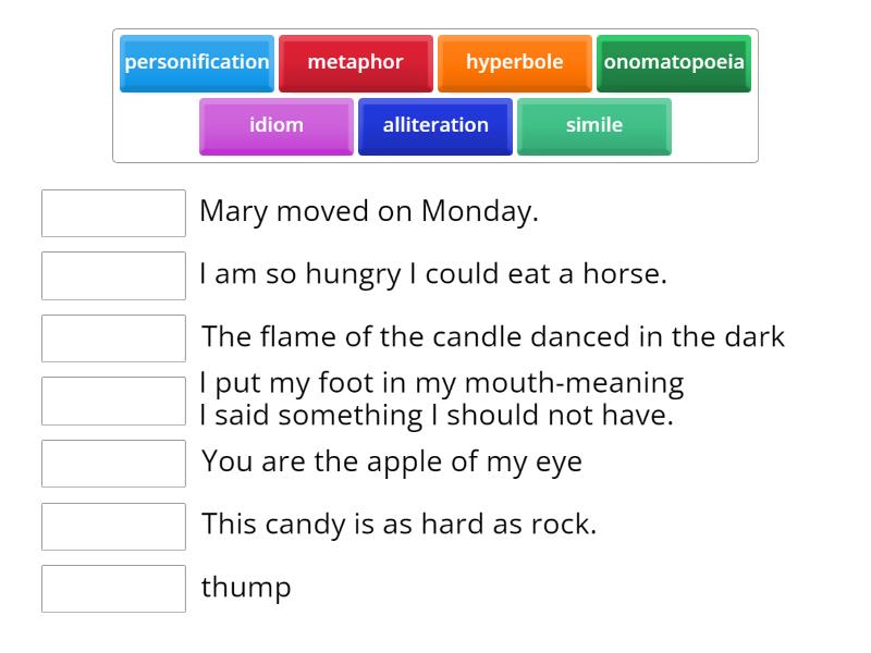 onomatopoeia - thump, simile - This candy is as hard as rock., metaphor - You are the apple of my eye, alliteration - Mary moved on Monday., personification - The flame of the candle danced in the dark, hyperbole - I am so hungry I could eat a horse., idiom - I put my foot in my mouth-meaning I said something I should not have.,