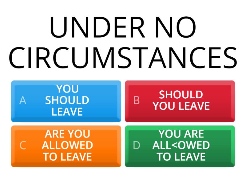 1) UNDER NO CIRCUMSTANCES a) YOU SHOULD LEAVE b) SHOULD YOU LEAVE c) ARE YOU ALLOWED TO LEAVE  d) YOU ARE ALL<OWED TO LEAVE 2) TAKE OVER  a) GET OUT b) GET CONTROL c) TAKE SOMETHING 3) WHO KNOWS... a) THERE`S NO ONE KNOWING b) WNO ONE KNOWS c) THERE`S NO KNOWING 4) GAIN... a) LOVE b) ENTRY c) ENTRANCE d) ACCESS e) DOOR 5) TO BE CAPABLE... a) ON SOMETHING b) TO DO SOMETHING c) OF DOING SOMETHING 6) GIVE UP  a) START DOING b) SURRENDER c) INVENT SOMETHING 7) I CAN SEE NO POINT... a) IN DOING SOMETHING b) ON DOING SOMETHING c) OF DOING SOMETHING 8) DENY a) STEAL b) STEALING c) HAVING STOLEN 9) TO HIT THE BOOKS a) THROW THE BOOKS AWAY b) STUDY c) DO EXERCISES 10) TO BE ON THE SAME WAVELENGTH a) TO SWIM TOGETHER b) TO AGREE c) TO SHARE THE SAME LIKES AND DISLIKES 11) SEE EYE TO EYE a) AGREE b) DISAGREE c) PARTIALLY AGREE 12) A FINGER IN EVERY PIE a) STUDY A LOT b) INVOLVED IN MANY ACTIVITIES c) TALK TO MANY PEOPLE 13) PAY THROUGH THE NOSE a) SPEND TOO MUCH ON SOMETHING b) SAVE MONEY c) KEEP COSTS TO A MINIMUM