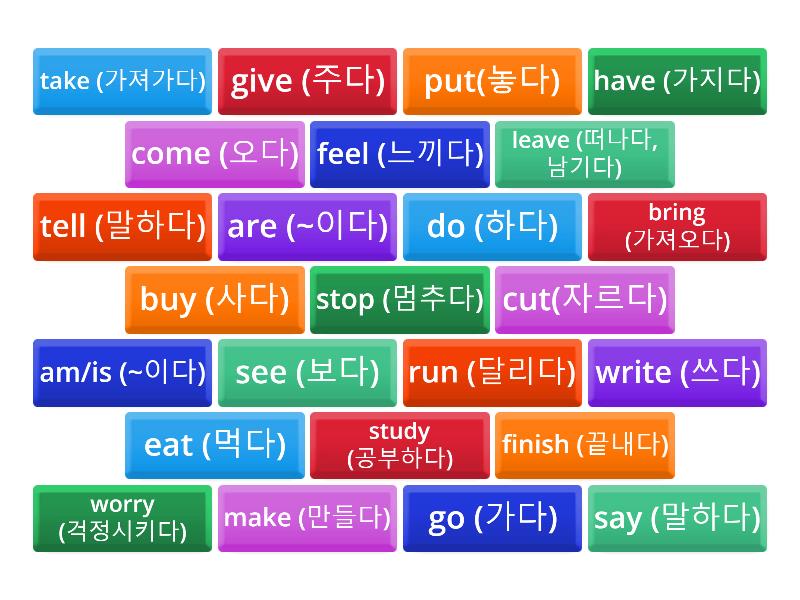 put(놓다) - put, cut(자르다) - cut, am/is (~이다) - was, are (~이다) - were, do (하다) - did, have (가지다) - had, go (가다) - went, come (오다) - came, take (가져가다) - took, make (만들다) - made, see (보다) - saw, run (달리다) - ran, eat (먹다) - ate, write (쓰다) - wrote, give (주다) - gave, feel (느끼다) - felt, leave (떠나다, 남기다) - left, buy (사다) - bought, bring (가져오다) - brought, say (말하다) - said, tell (말하다) - told, finish (끝내다) - finished, worry (걱정시키다) - worried, study (공부하다) - studied, stop (멈추다) - stopped,