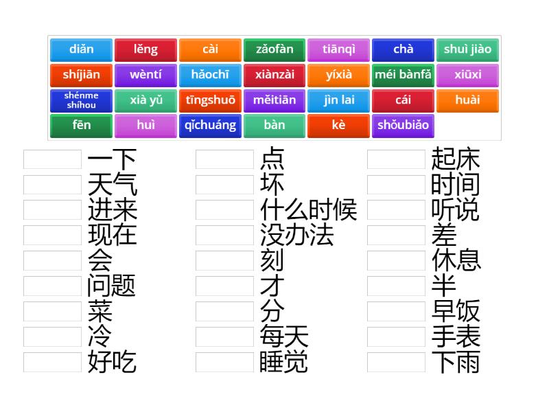jìn lai - 进来, yíxià - 一下, xiànzài - 现在, diǎn - 点, shǒubiǎo - 手表, huài - 坏, fēn - 分, bàn - 半, qǐchuáng - 起床, cái - 才, wèntí - 问题, zǎofàn - 早饭, shíjiān - 时间, měitiān - 每天, shuì jiào - 睡觉, xiūxi - 休息, tiānqì - 天气, tīngshuō - 听说, lěng - 冷, huì - 会, xià yǔ - 下雨, cài - 菜, hǎochī - 好吃, shénme shíhou - 什么时候, chà - 差, méi bànfǎ - 没办法, kè - 刻,